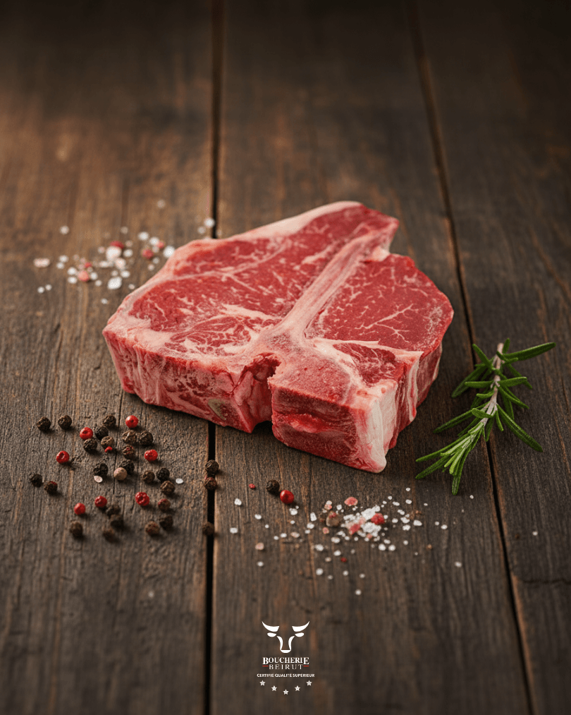 Chez Boucherie Beirut, nous sélectionnons des coupes premium avec un excellent persillage des deux côtés de l’os. Le côté filet offre la tendreté, tandis que le côté contre-filet livre une saveur riche. Nous parons chaque steak à la main pour assurer une présentation impeccable.